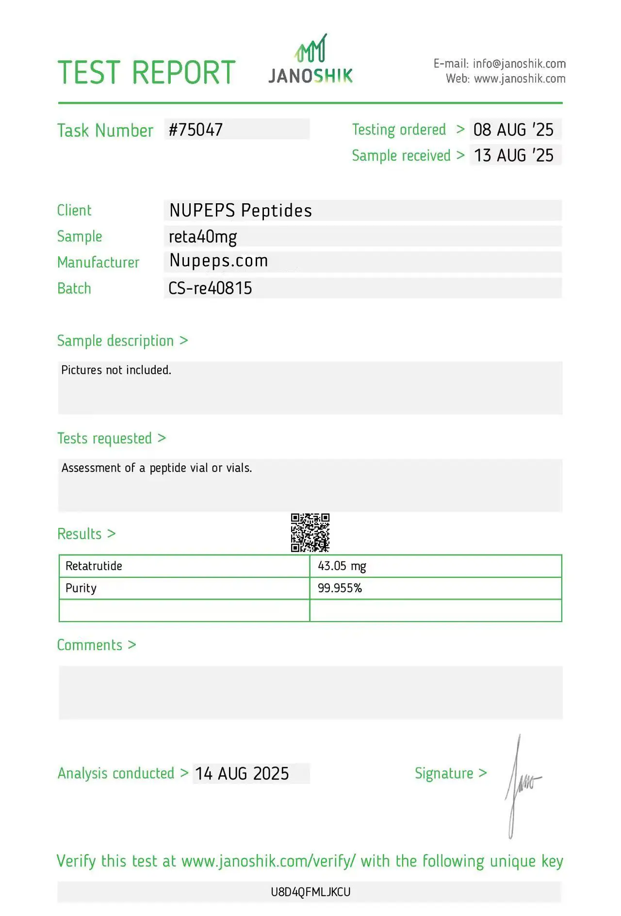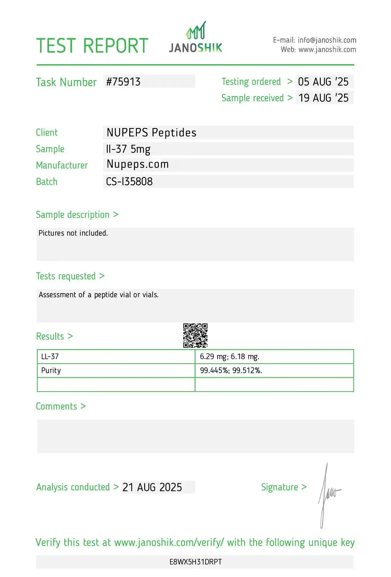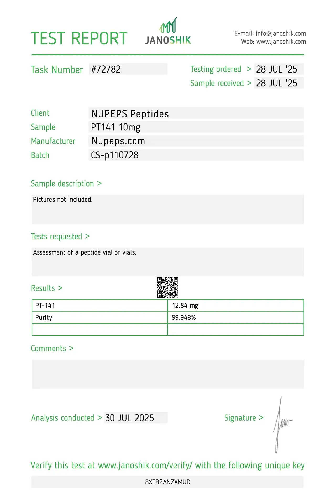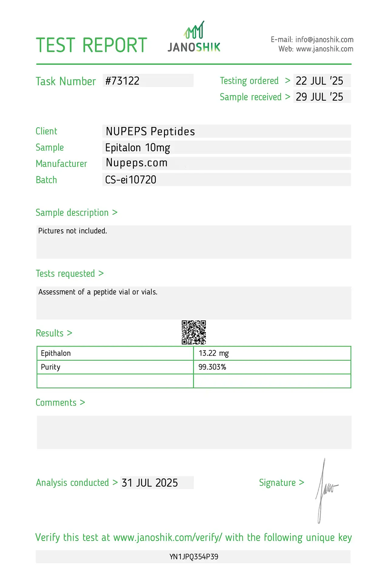 To ensure high consistency, our products are formulated with ultra-high raw material content. Items labeled as over 99% purity are manufactured to reliably meet that level. Occasionally, slight differences may appear between Janoshik’s analysis and our original raw material composition.
