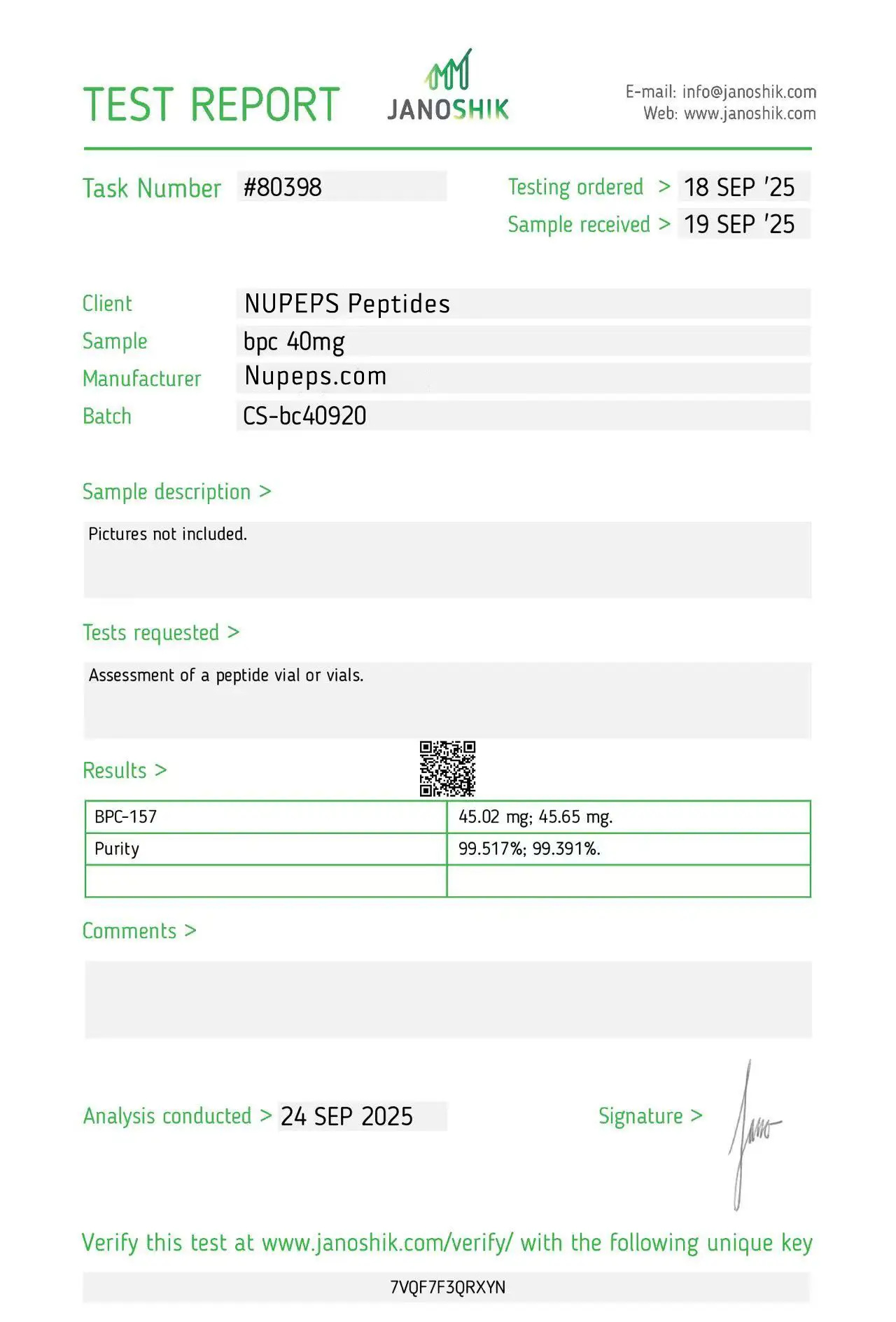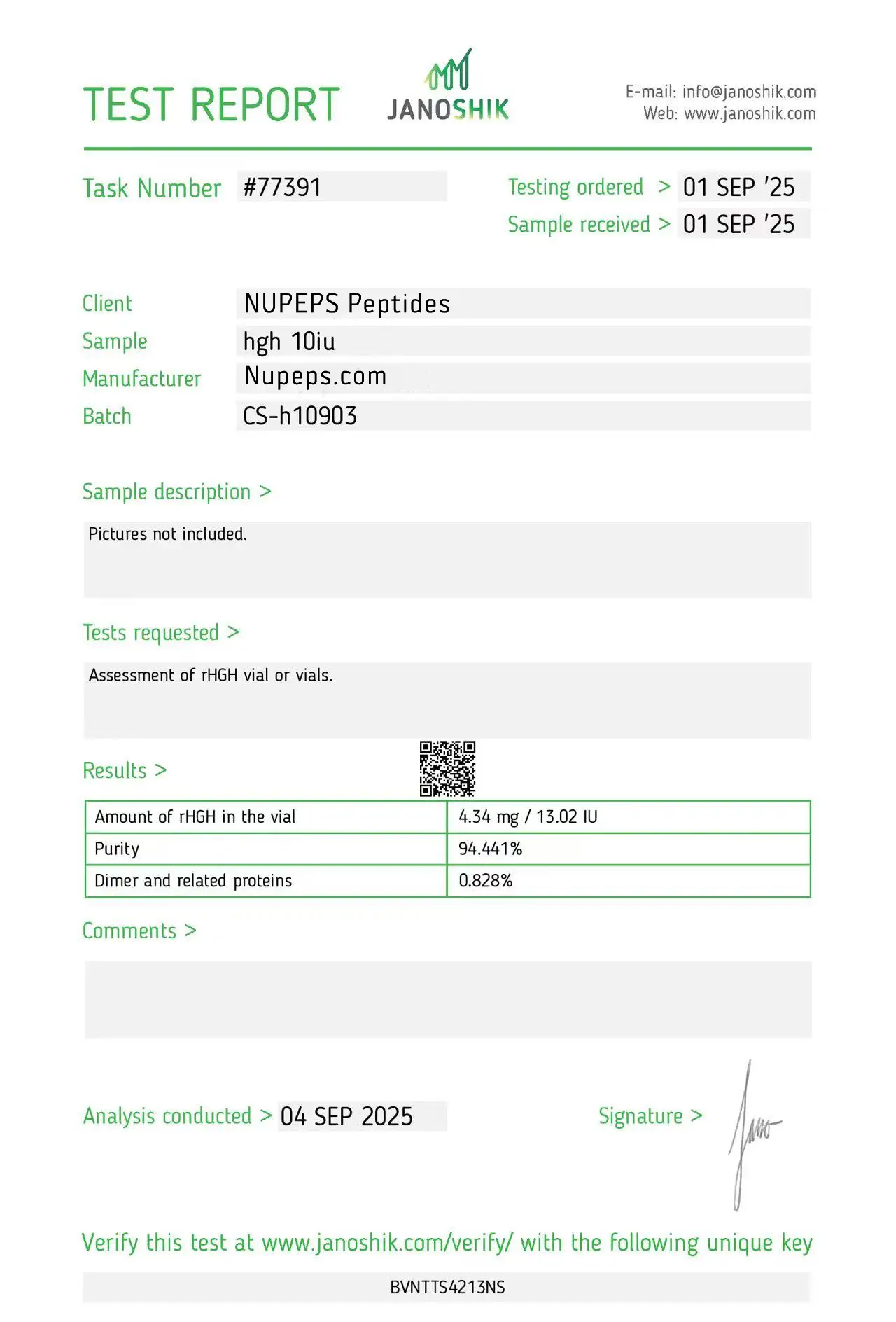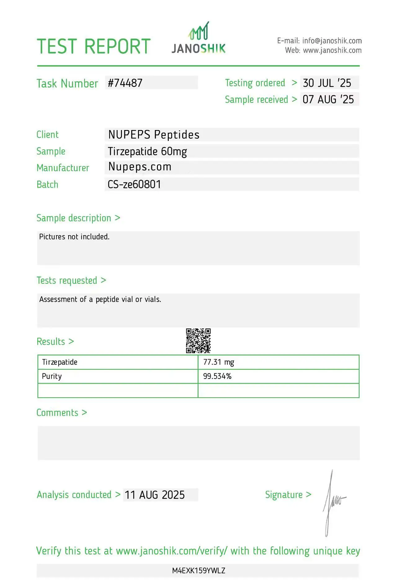 To ensure high consistency, our products are formulated with ultra-high raw material content. Items labeled as over 99% purity are manufactured to reliably meet that level. Occasionally, slight differences may appear between Janoshik’s analysis and our original raw material composition.