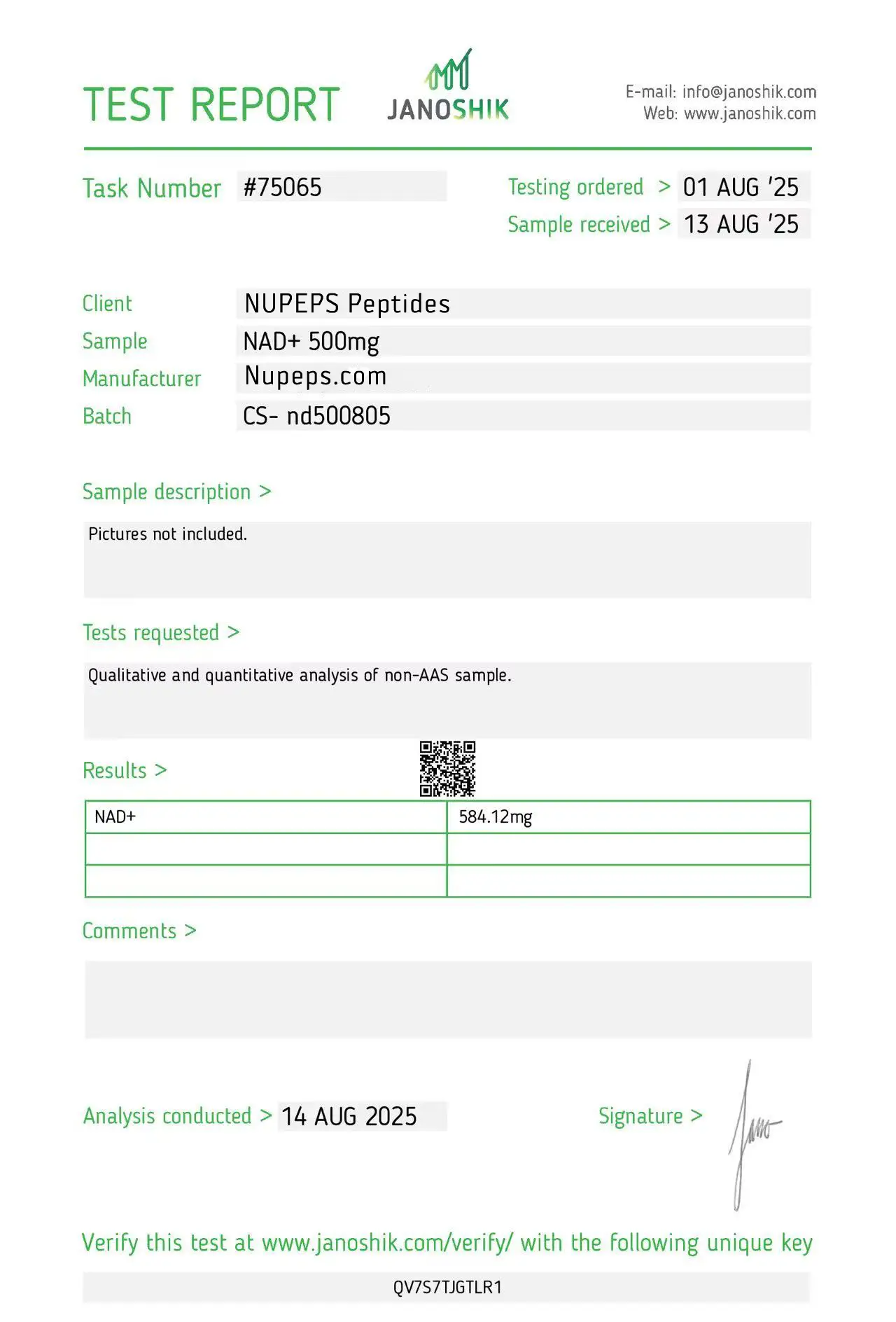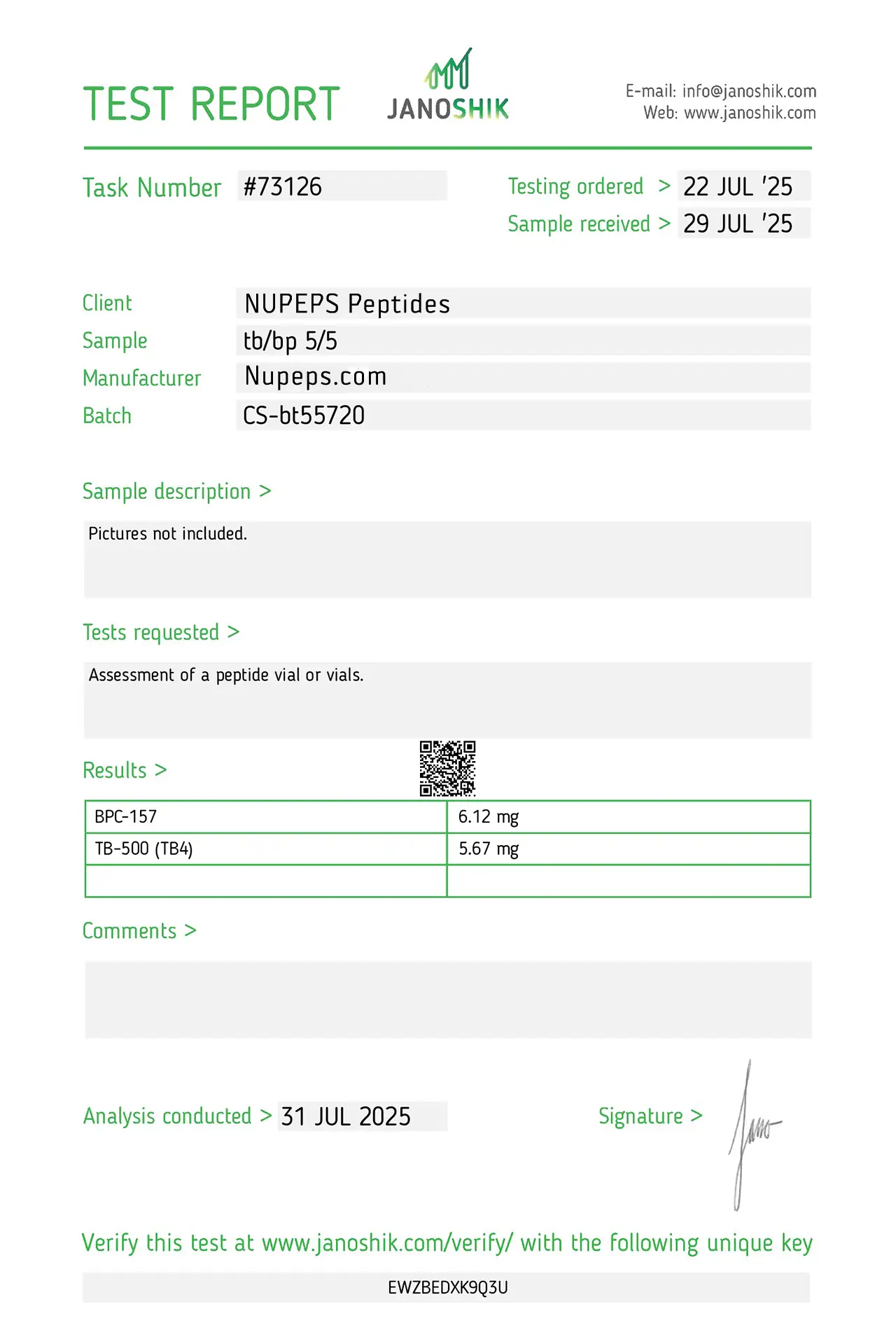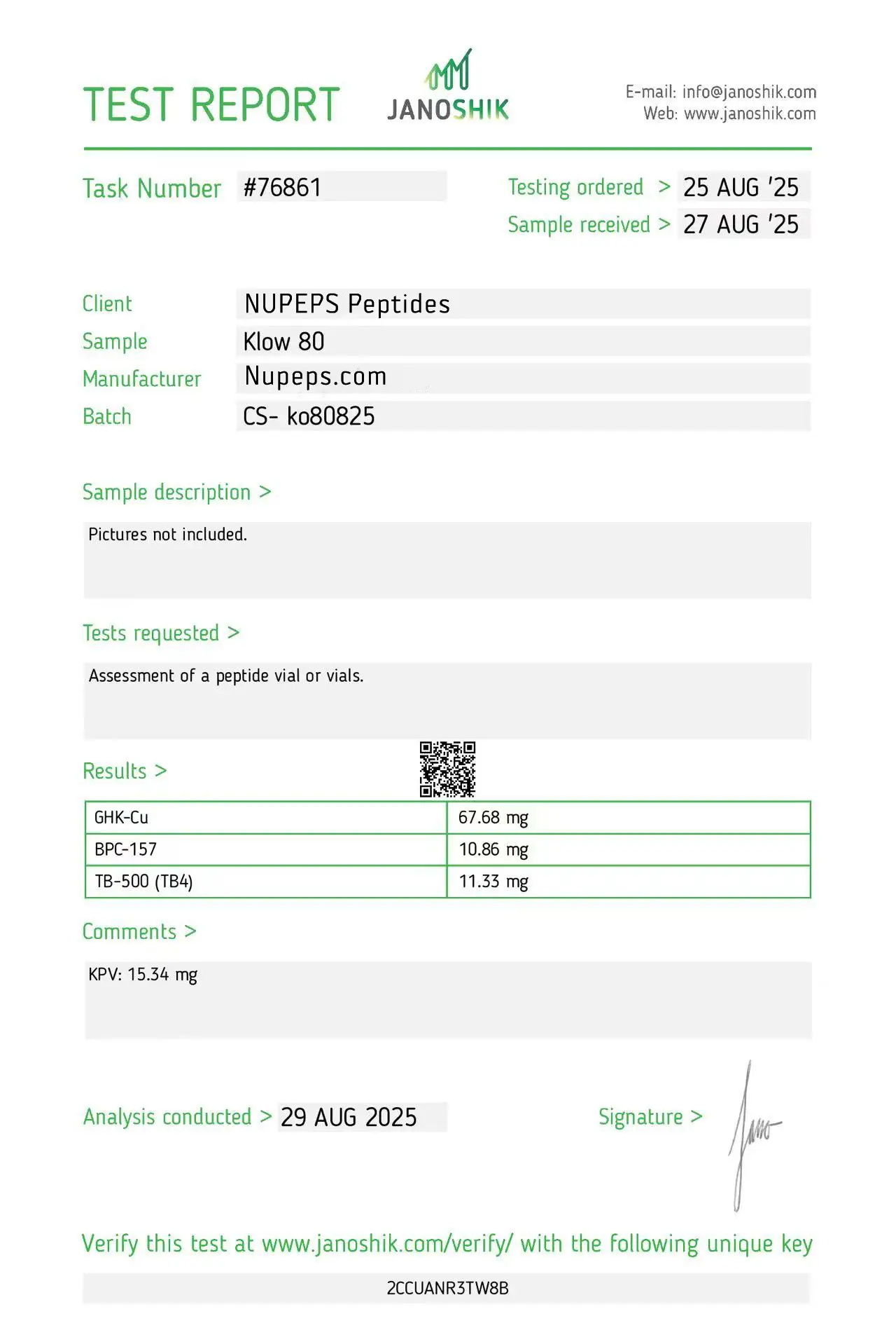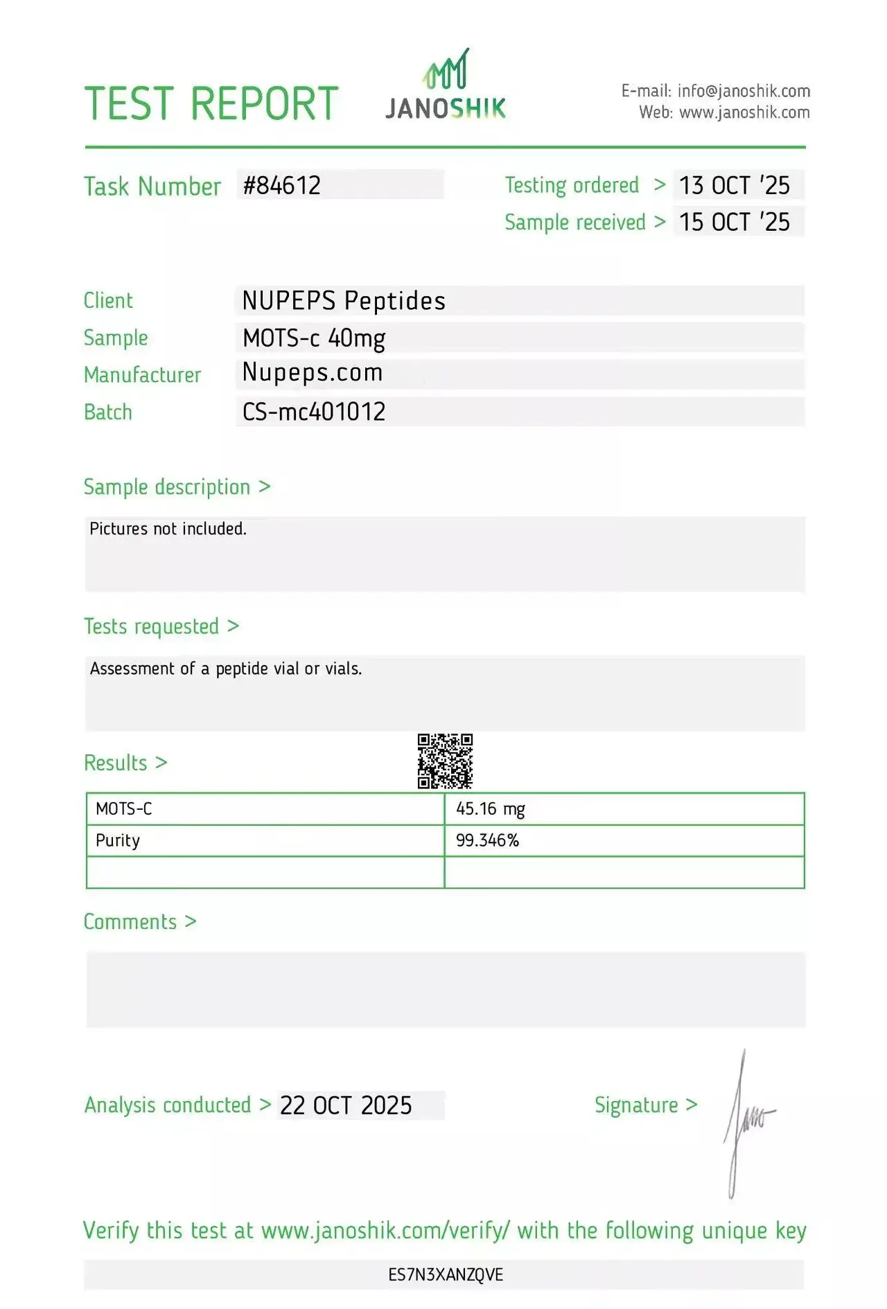 To ensure high consistency, our products are formulated with ultra-high raw material content. Items labeled as over 99% purity are manufactured to reliably meet that level. Occasionally, slight differences may appear between Janoshik’s analysis and our original raw material composition.